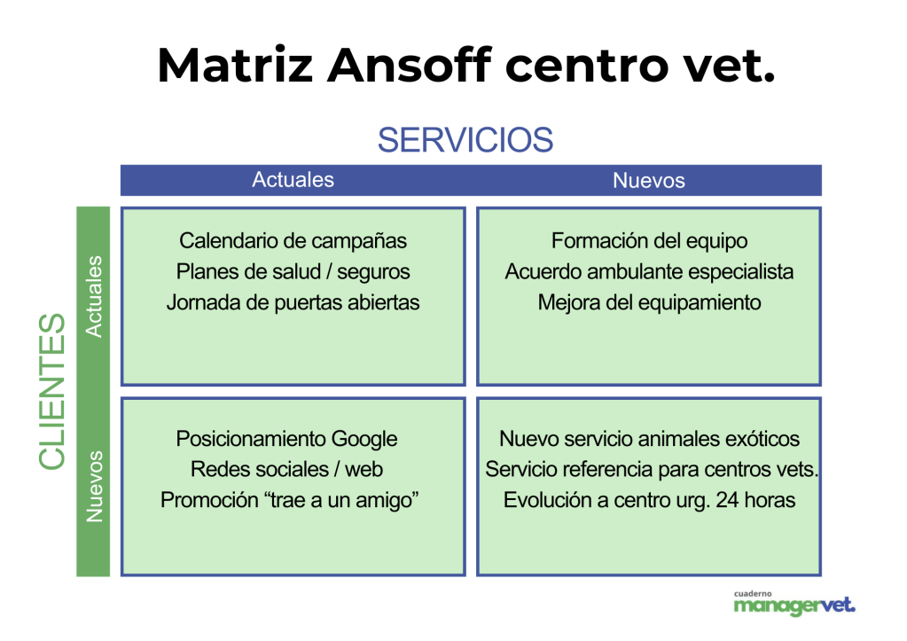 4 estrategias de crecimiento de la Matriz de Ansoff para un centro veterinario: